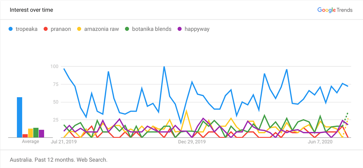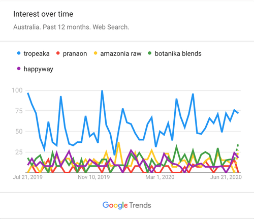 The below Google Trends Report shows the level of consumer interest compared to our competitors between July 2019 to July 2020. This report can be generated by going to https://trends.google.com.au/ and adding in each brand name for comparison. As you can see, Tropeaka well and truly leads the way in consumer interest!